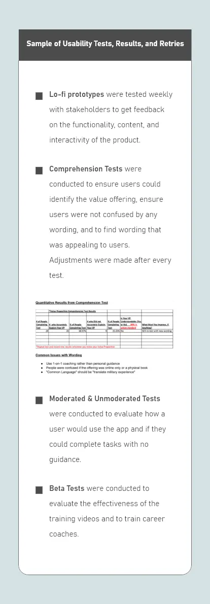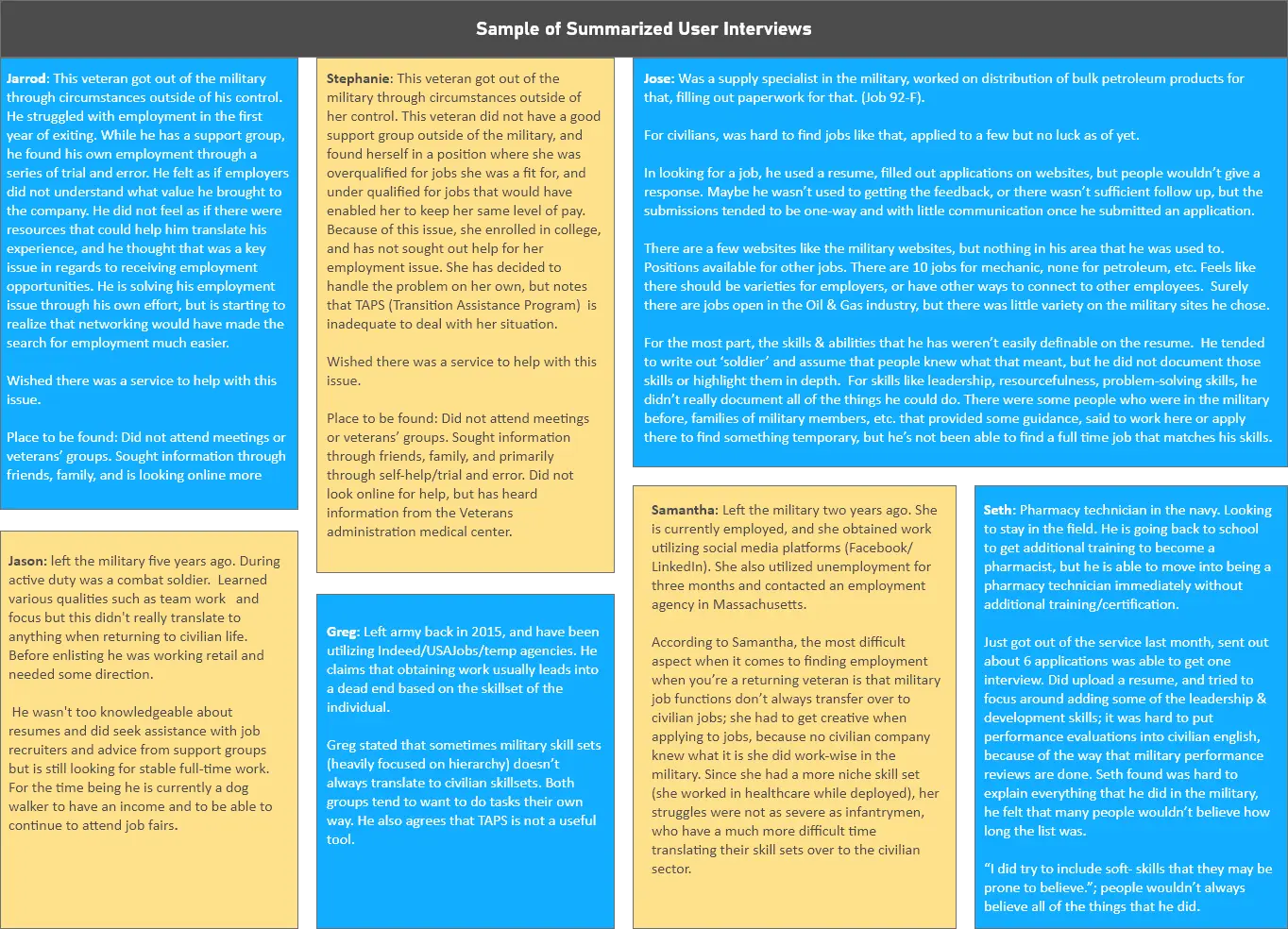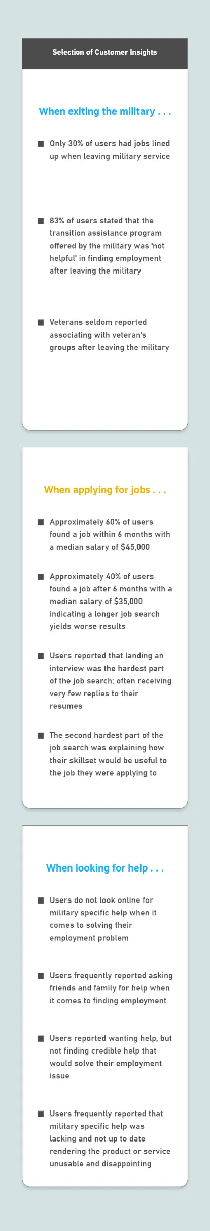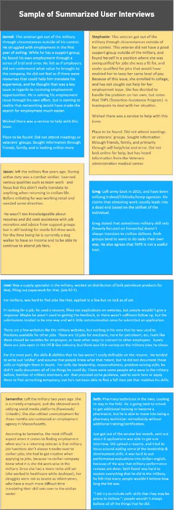 Understanding customer behavior is very important in designing a solution for a specific user group. We wanted to understand the pains that veterans felt when applying for jobs, how they overcame those challenges, if those solutions worked, and what they are currently doing to overcome their employment problems. Below is a brief look at the insights we gained from interviewing 80 veterans with employment issues.