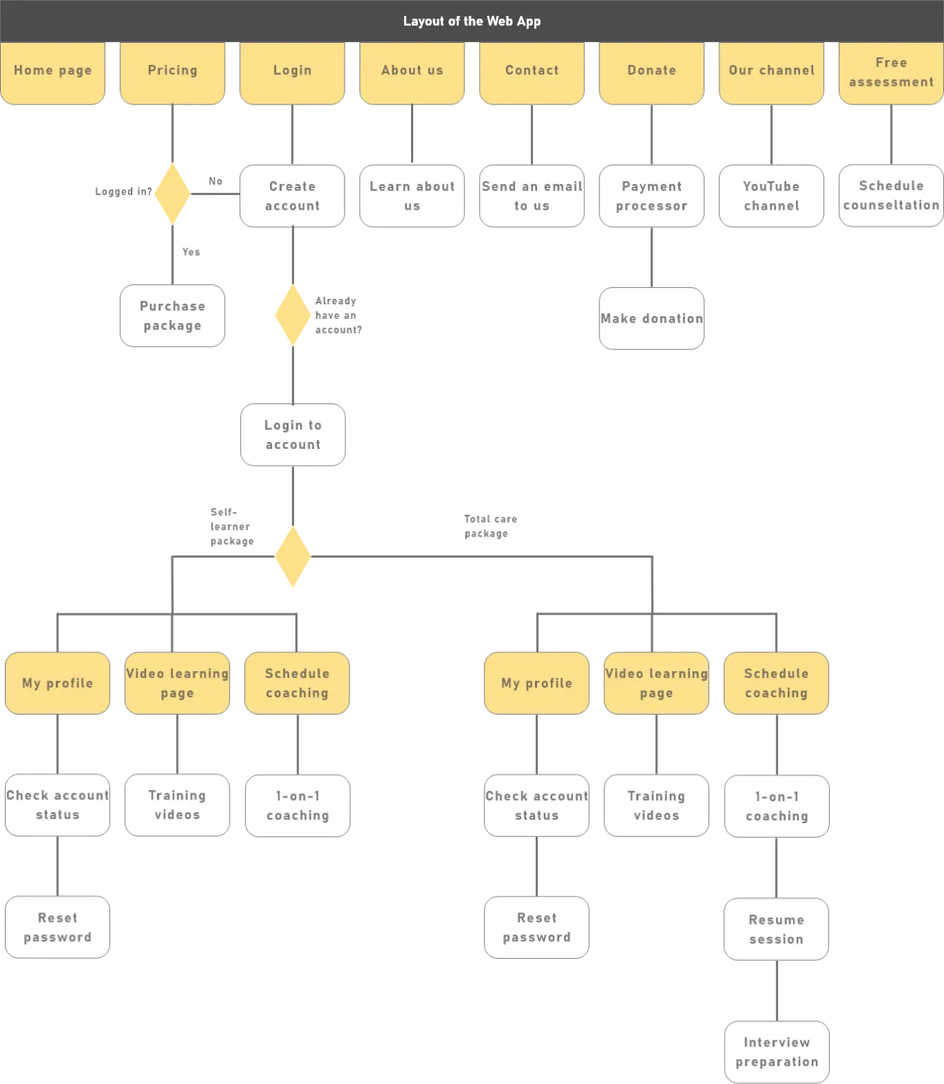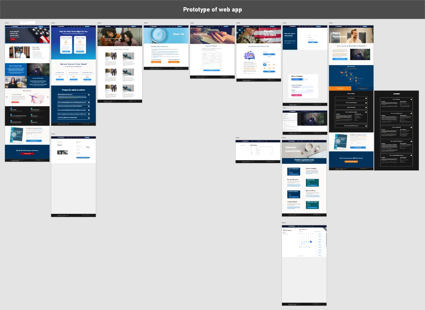 While there was significant similarities between customers, there was a major difference in the amount of help that a veteran would want from a service such as this. Some veterans just wanted to learn how to write resumes and prepare for interviews. Other veterans wanted a bit more hand holding throughout the process. This had major implications for the development of our web app as it meant we would need to detect and show different screens depending on the user's access. Below is how we designed our app to accommodate the user's needs.