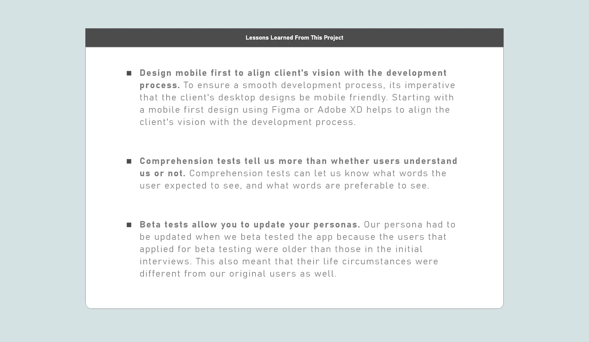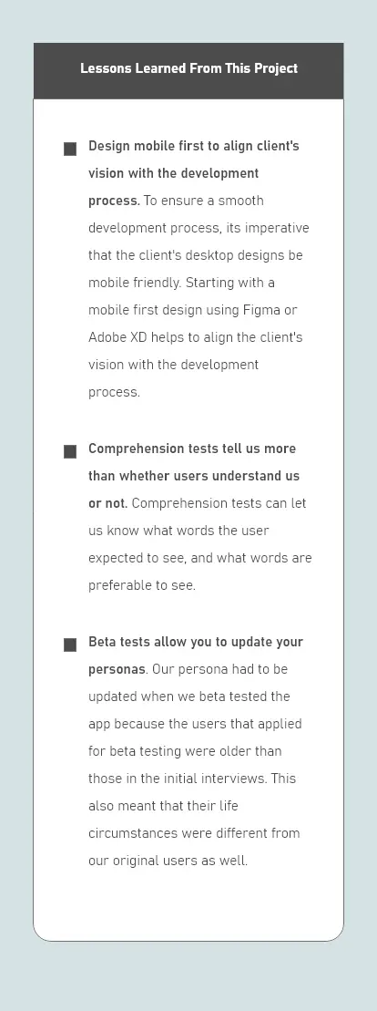 Building unique and valuable user experiences is never straight forward because of the often different and sometimes competing needs of the business, stakeholders, and customers. However, each project allows me to reflect and better my building approach for the next project. Below are a few lessons learned from this project.