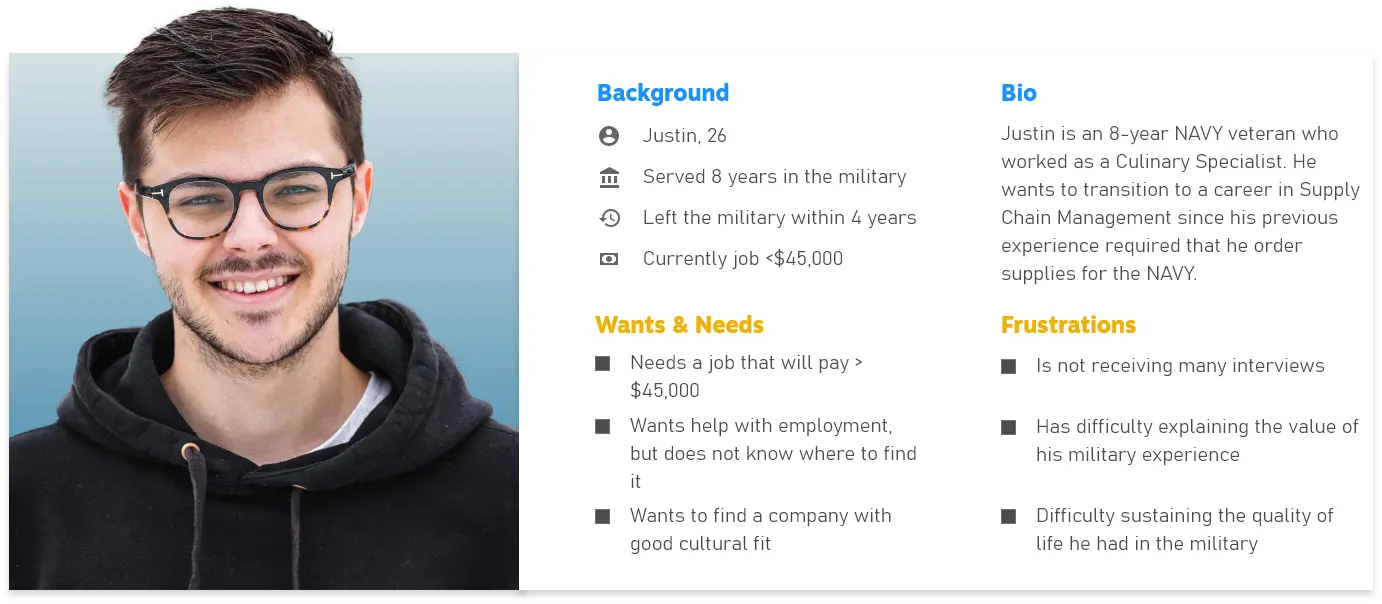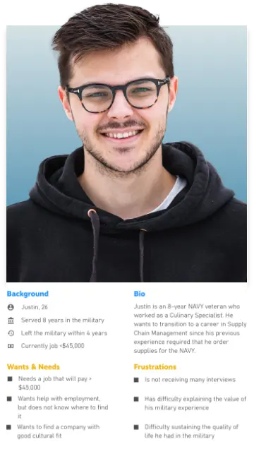 During the interview and survey phase of our research, we started to notice significant similarities in veterans who reported employment problems. These members tended to fall between the ages of 22 - 30, were enlisted, made less than $35,000, and typically left their first civilian job with 1 year. These same members also reported that their biggest frustrations were with resume writing, interview preparation, not having guidance with the job hunting process, and only started to look for help after encountering employment difficulties.